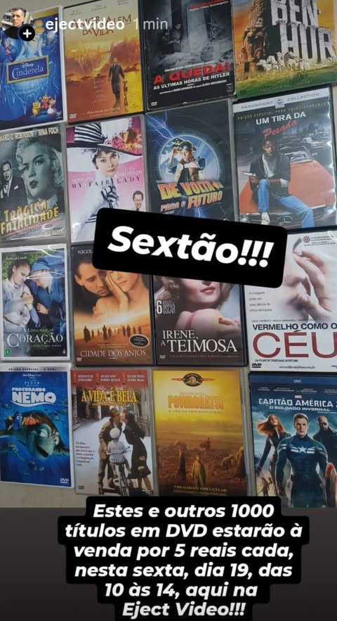 A Vídeo Locadora Eject Vídeo venderá nessa sexta-feira, dia 19 de Dezembro de 2025, das 10h às 14h, Filmes em DVDs por 5 reais.