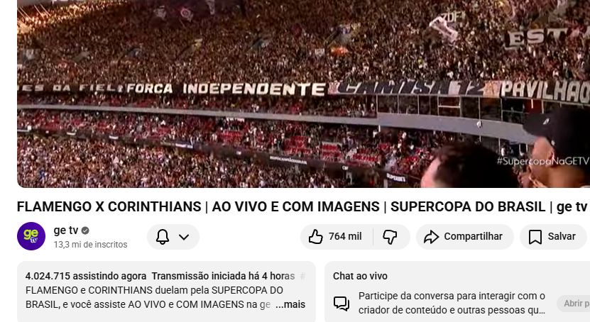 Canal da Globo no Youtube que trata de esportes teve mais de 4 milhões assistindo a final de Corinthians e Flamengo. No jogo que o Corinthians se sagrou campeão da Supercopa Rei 2026, GE TV registou mais de 4 milhões de views simultaneamente pelo Youtube. Corinthians venceu o jogo por 2 a 0.